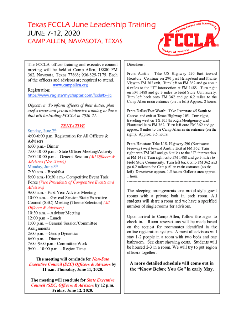 JUNE 712, 2020CAMP ALLEN, SARASOTA, Texas FCCLA officer training and executive council