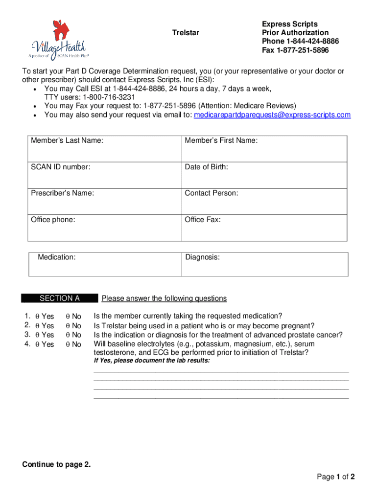 TrelstarExpress Scripts Prior Authorization Phone 18444248886 Fax 18772515896To start your Part D Coverage Determination request, you (or your representative or your doctor or other prescriber) should