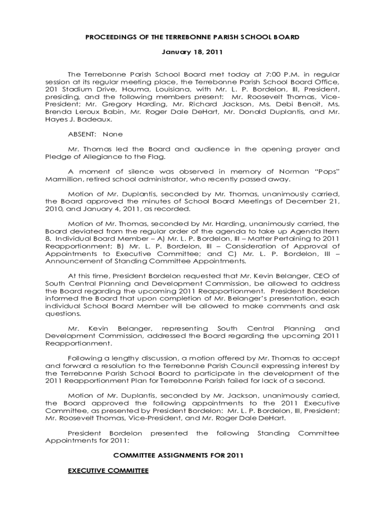 PROCEEDINGS OF THE TERREBONNE PARISH SCHOOL BOARD January 18, 2011 The Terrebonne Parish School Board met today at 7:00 P.M. in regular session at its regular meeting place, the Terrebonne Parish
