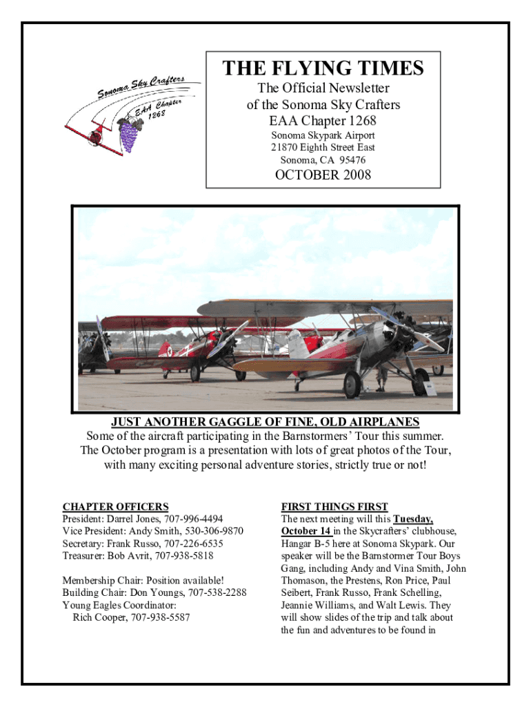 THE FLYING TIMES The Official Newsletter of the Sonoma Sky Crafters EAA Chapter 1268 Sonoma Skypark Airport 21870 Eighth Street East Sonoma, CA 95476OCTOBER 2008JUST ANOTHER GAGGLE OF FINE, OLD AIRPLANES