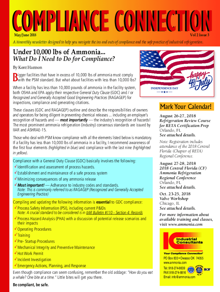 COMPLIANCE CONNECTION May/June 2018Vol 2 Issue 3A bimonthly newsletter designed to help you navigate the ins and outs of compliance and the safe practice of industrial refrigeration.Under 10,000 lbs