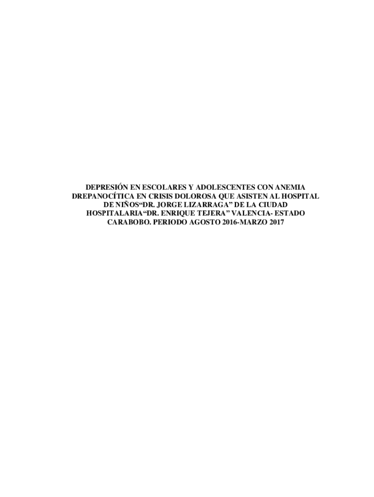 DEPRESIN EN ESCOLARES Y ADOLESCENTES CON ANEMIA DREPANOCTICA EN CRISIS DOLOROSA QUE ASISTEN AL HOSPITAL DE NIOSDR. JORGE LIZARRAGA DE LA CIUDAD HOSPITALARIADR. ENRIQUE TEJERA VALENCIA ESTADO CARABOBO.