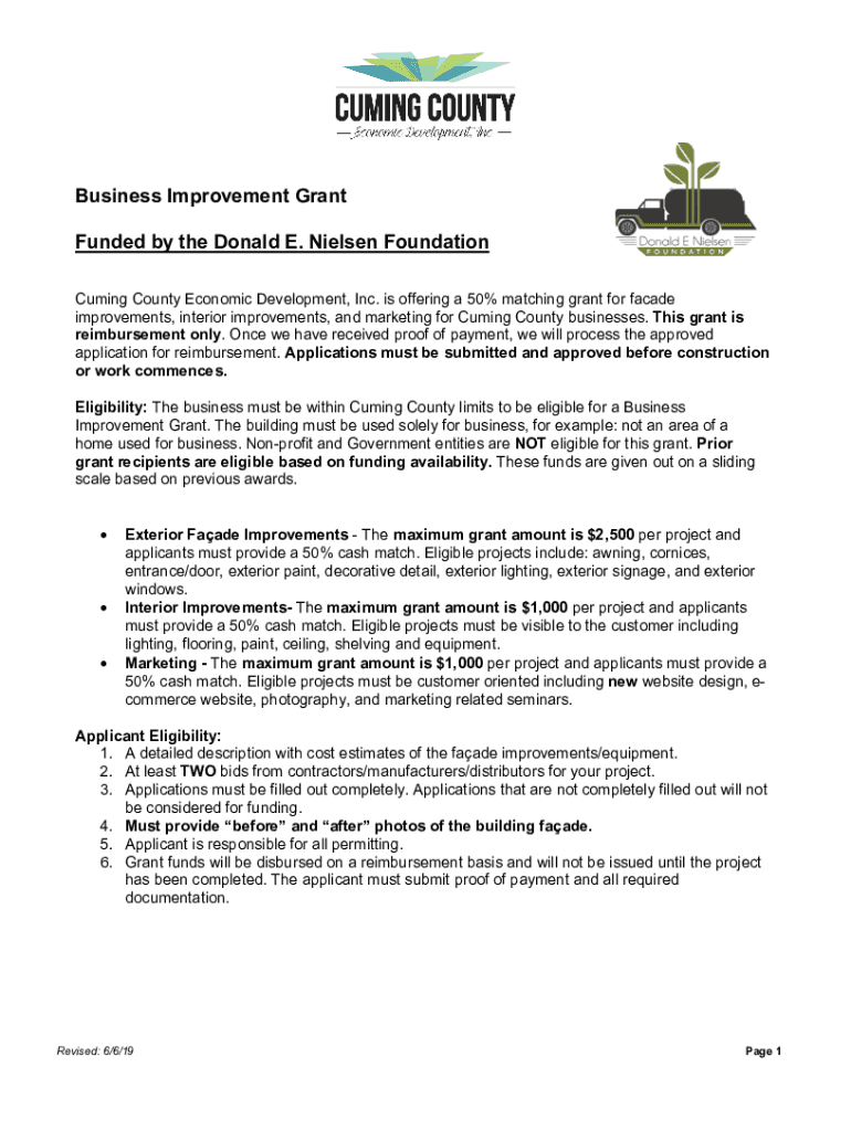 Business Improvement Grant Funded by the Donald E. Nielsen Foundation Cuming County Economic Development, Inc. is offering a 50% matching grant for facade improvements, interior improvements, and