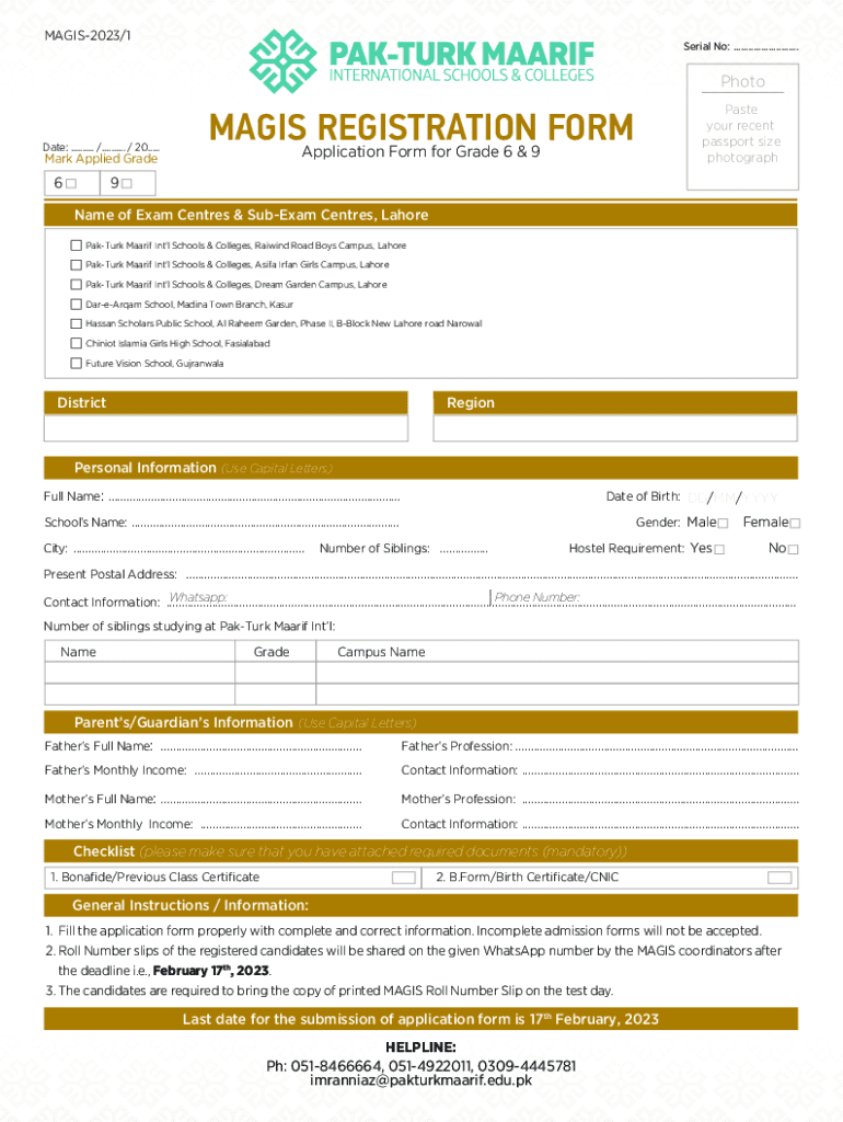 MAGIS2023/1Serial No: ..........................PhotoDate: .......... /.......... / 20.....Mark Applied Grade6Paste your recent passport size photographMAGISApplication REGISTRATION FORM Form for