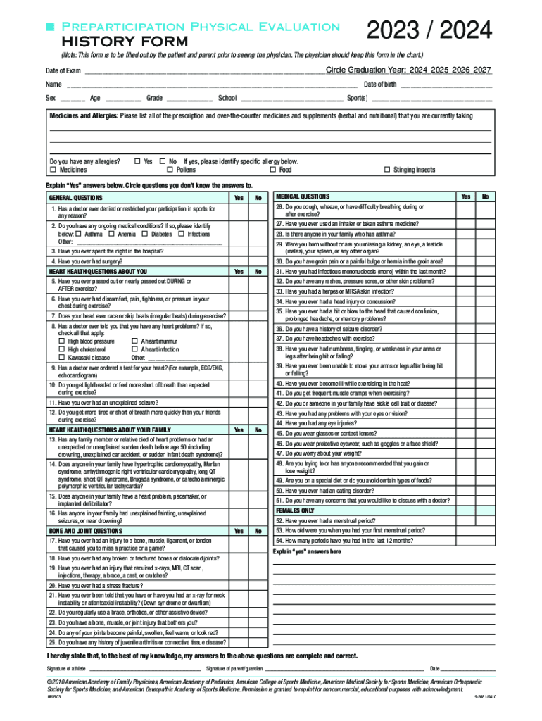 Preparticipation Physical Evaluation HISTORY FORM2023 / 2024(Note: This form is to be filled out by the patient and parent prior to seeing the physician. The physician should keep this form in the