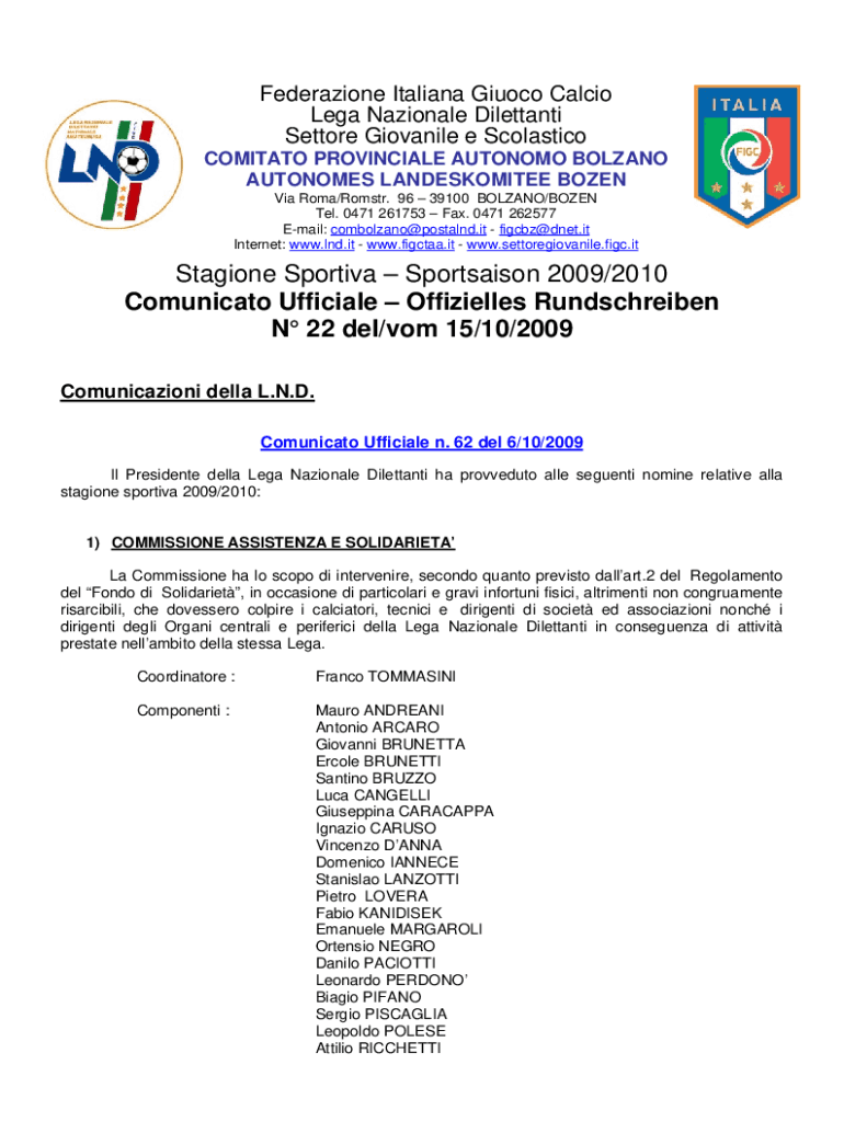 Federazione Italiana Giuoco Calcio Lega Nazionale Dilettanti Settore Giovanile e Scolastico COMITATO PROVINCIALE AUTONOMO BOLZANO AUTONOMES LANDESKOMITEE BOZEN Via Roma/Romstr. 96 39100 BOLZANO/BOZEN