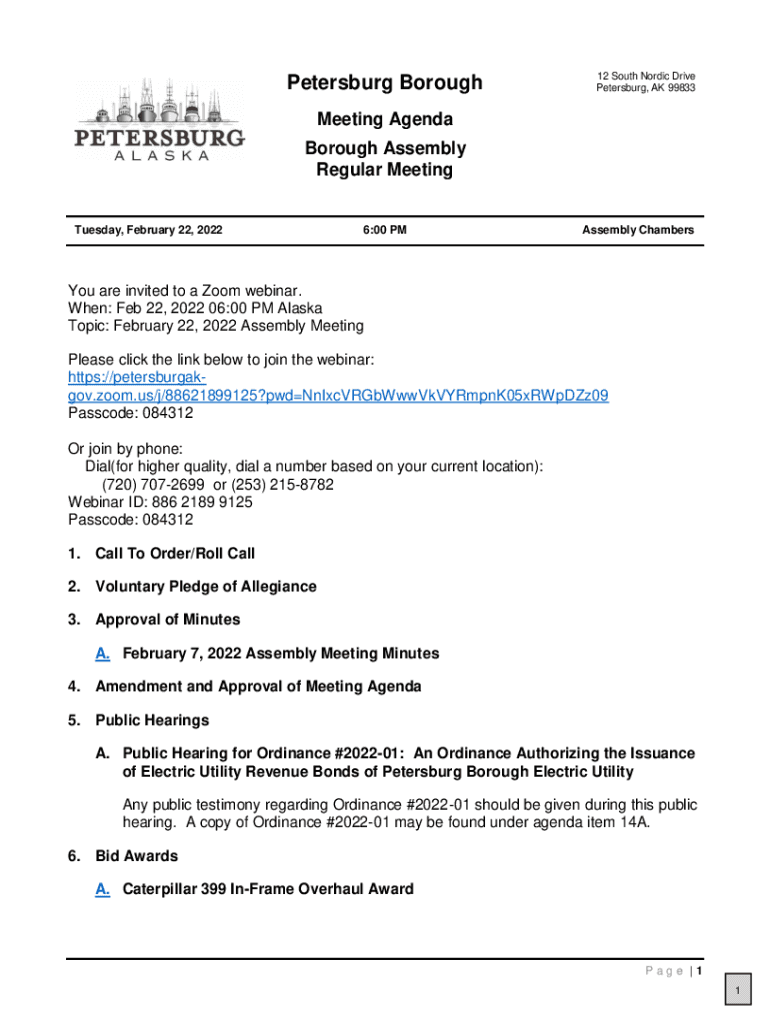 Petersburg Borough12 South Nordic Drive Petersburg, AK 99833Meeting Agenda Borough Assembly Regular MeetingTuesday, February 22, 20226:00 PMAssembly ChambersYou are invited to a Zoom webinar. When: