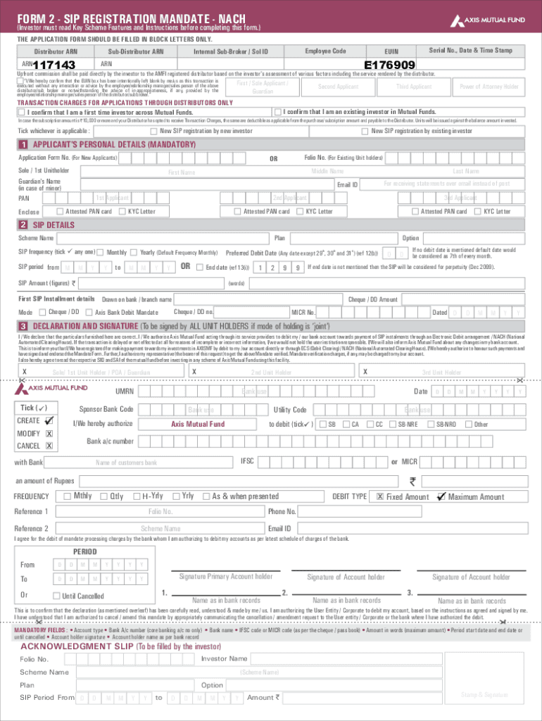 FORM 2 SIP REGISTRATION MANDATE NACH(Investor must read Key Scheme Features and Instructions before completing this form.) THE APPLICATION FORM SHOULD BE FILLED IN BLOCK LETTERS ONLY. Distributor