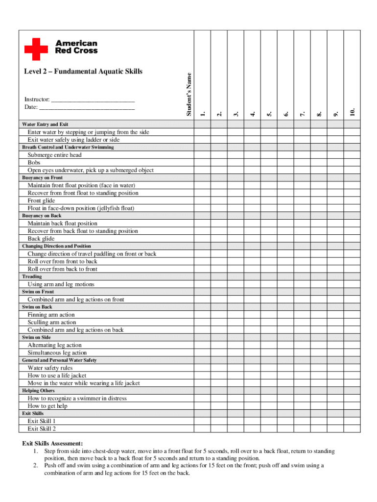 Water Entry and ExitEnter water by stepping or jumping from the side Exit water safely using ladder or side Breath Control and Underwater SwimmingSubmerge entire head Bobs Open eyes underwater, pick