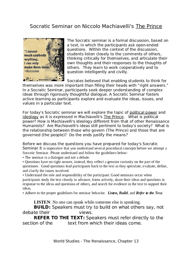 Socratic Seminar on The Prince by Machiavelli w/ Quotes & ... template instructions