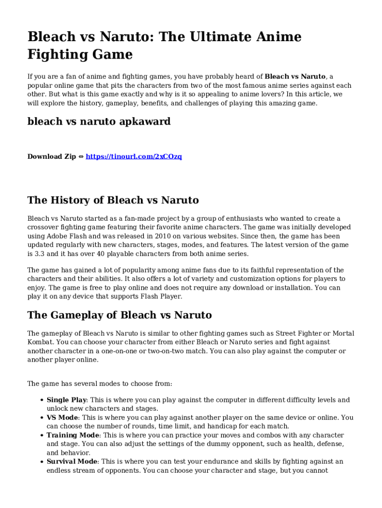 On an Android device, use the pdfFiller mobile app to finish your bleach vs naruto what. The program allows you to execute all necessary document management operations, such as adding, editing, and removing text, signing, annotating, and more. You only need a smartphone and an internet connection.