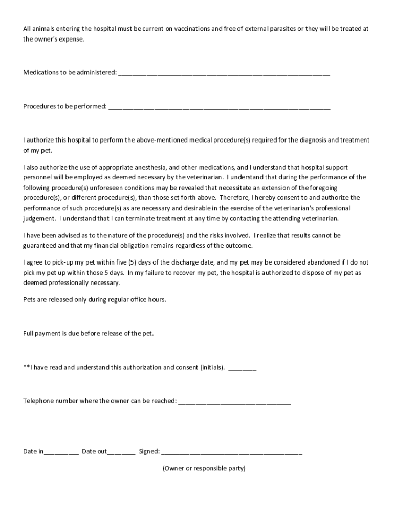 All animals entering the hospital must be current on vaccinations and free of external parasites or they will be treated at the owner\'s expense.Medications to be administered: ___Procedures to be