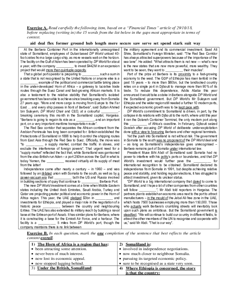 Exercise A. Read carefully the following item, based on a Financial Times article of 29/10/18, before replacing (writing in) the 15 words from the list below in the gaps most appropriate in terms