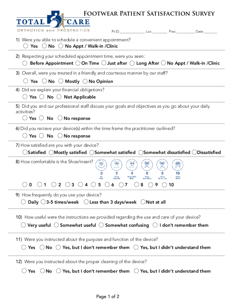 Footwear Patient Satisfaction Survey Pt ID:___ Loc:___ Prac:___ Date:___1) Were you able to schedule a convenient appointment? Yes No No Appt / Walkin /Clinic 2) Respecting your scheduled appointment