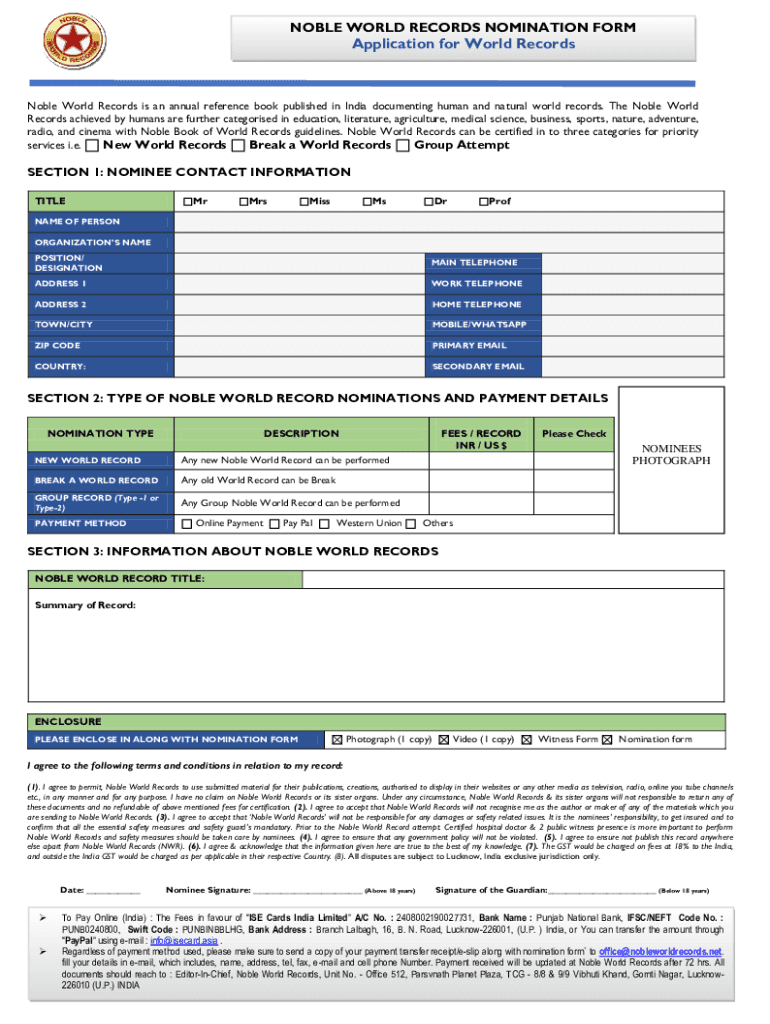 To fill out a Nobel World Records nomination, complete the nomination form with relevant details about the candidate, including their achievements and supporting documentation.