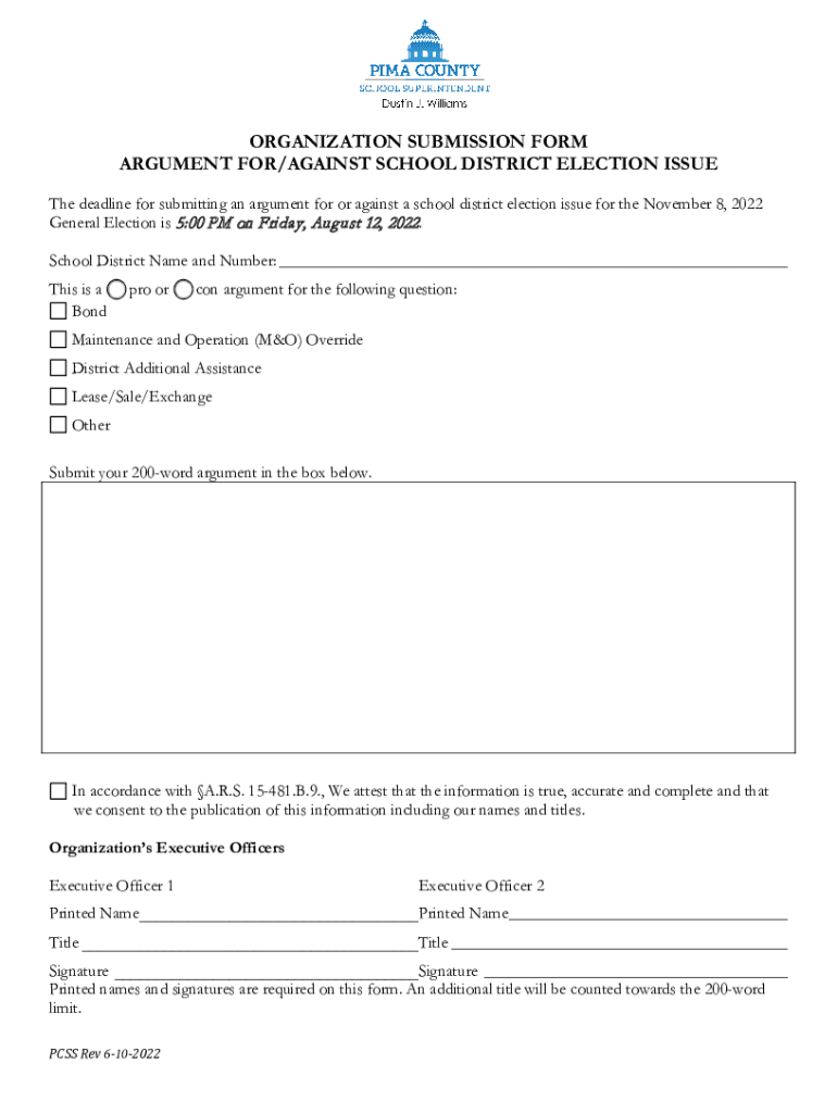 Generally, registered voters, school board members, or community organizations interested in influencing policy decisions can file arguments for or against a school district.