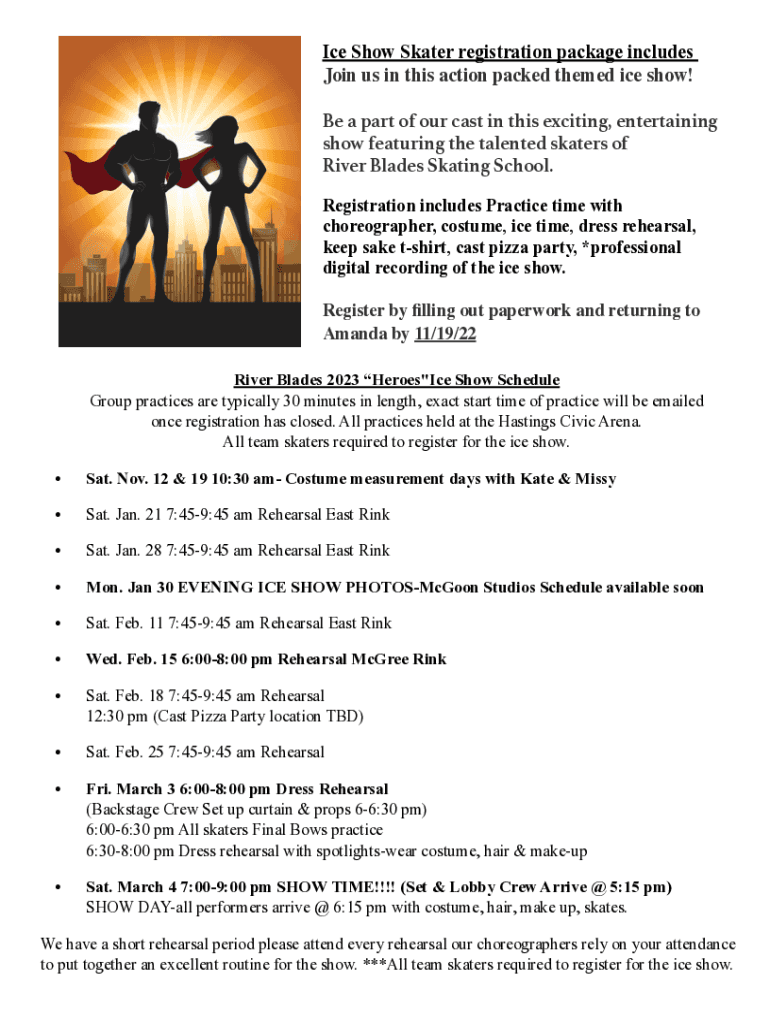 Ice Show Skater registration package includes Join us in this action packed themed ice show! Be a part of our cast in this exciting, entertaining show featuring the talented skaters of River Blades