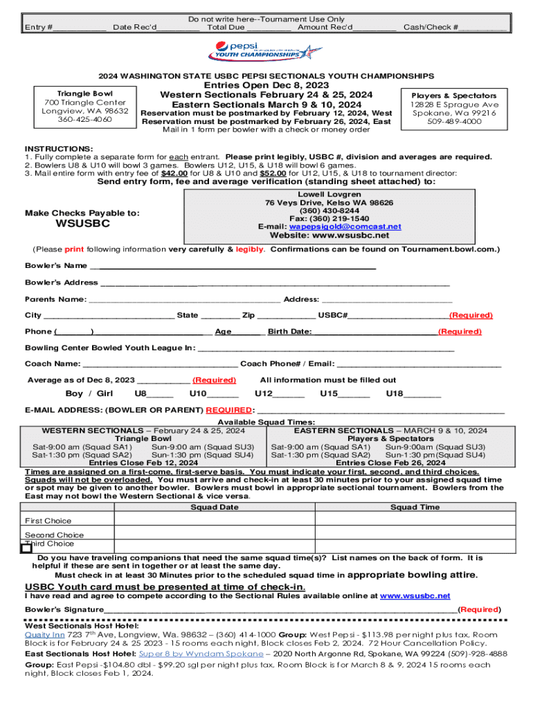Do not write hereTournament Use Only Entry #___ Date Recd___ Total Due ___ Amount Recd___ Cash/Check #___2024 WASHINGTON STATE USBC PEPSI SECTIONALS YOUTH CHAMPIONSHIPSEntries Open Dec 8, 2023 Western