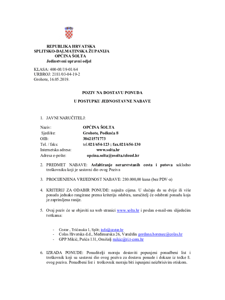 REPUBLIKA HRVATSKA SPLITSKODALMATINSKA UPANIJA OPINA OLTA Jedinstveni upravni odjel KLASA: 40008/1901/64 URBROJ: 2181/0304192 Grohote, 16.05.2019. POZIV NA DOSTAVU PONUDA U POSTUPKU JEDNOSTAVNE NABAVE1.