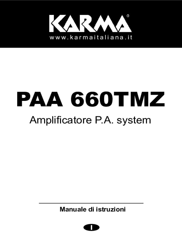 w w w. k a r m a i t a l i a n a . i tPAA 660TMZ Amplificatore P.A. systemManuale di istruzioni IComplimenti per la sua ottima scelta. Ci complimentiamo vivamente per la Sua scelta, il prodotto Karma