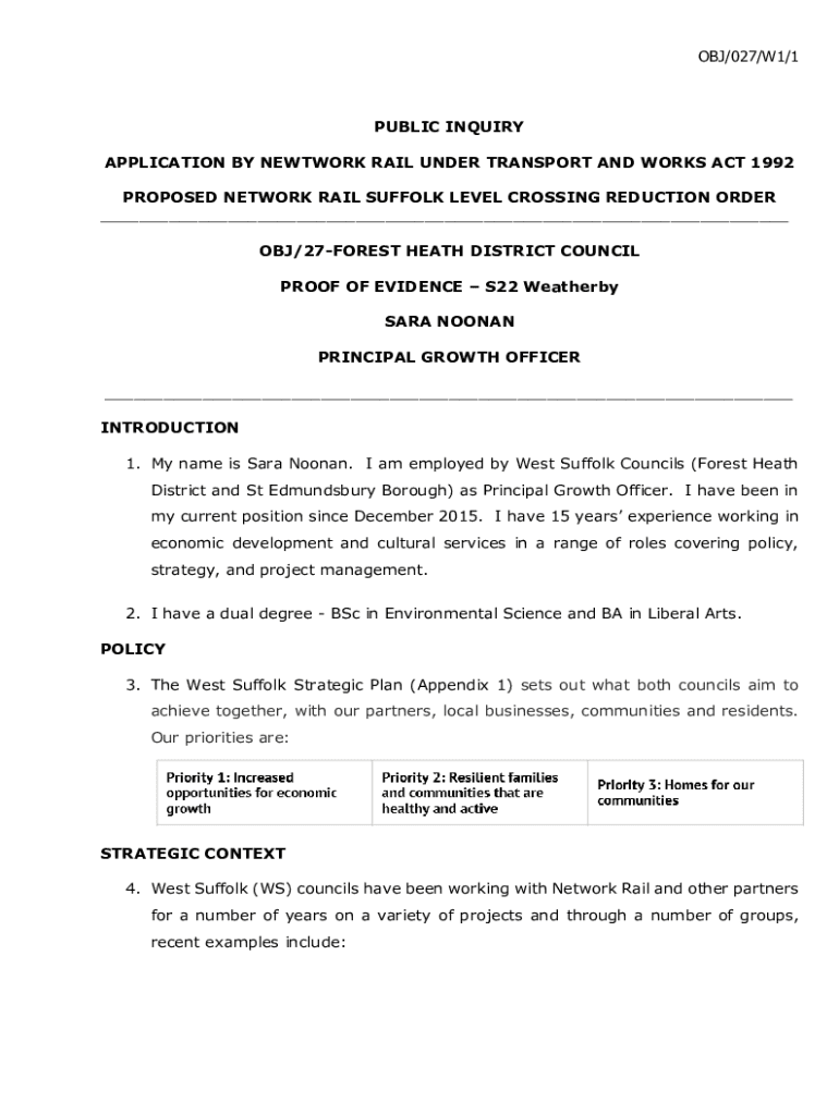 OBJ/027/W1/1PUBLIC INQUIRY APPLICATION BY NEWTWORK RAIL UNDER TRANSPORT AND WORKS ACT 1992 PROPOSED NETWORK RAIL SUFFOLK LEVEL CROSSING REDUCTION ORDER ___ OBJ/27FOREST HEATH DISTRICT COUNCIL PROOF