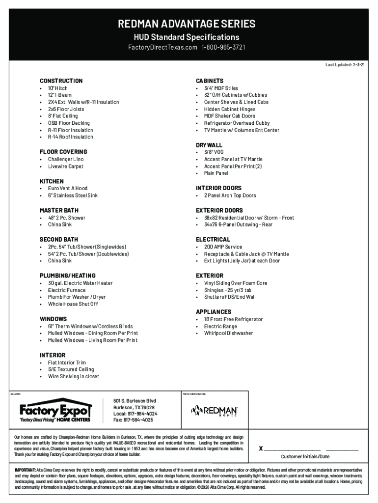 REDMAN ADVANTAGE SERIES HUD Standard SpecificationsFactoryDirectTexas.com 18009653721 Last Updated: 2321CONSTRUCTION 10 Hitch 12 IBeam 2X4 Ext. Walls w/R11 Insulation 2x6 Floor Joists 8 Flat Ceiling