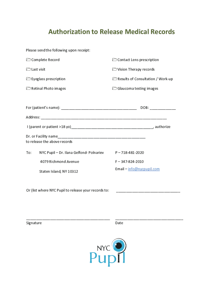 Authorization to Release Medical Records Please send the following upon receipt: Complete RecordContact Lens prescriptionLast visitVision Therapy recordsEyeglass prescriptionResults of Consultation