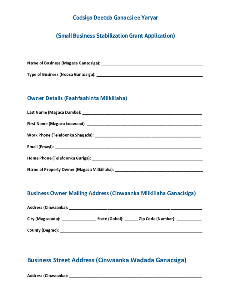 Codsiga Deeqda Ganacsi ee Yaryar (Small Business Stabilization Grant Application)Name of Business (Magaca Ganacsiga): ___ Type of Business (Nooca Ganacsiga): ___Owner Details (Faahfaahinta Milkiilaha)