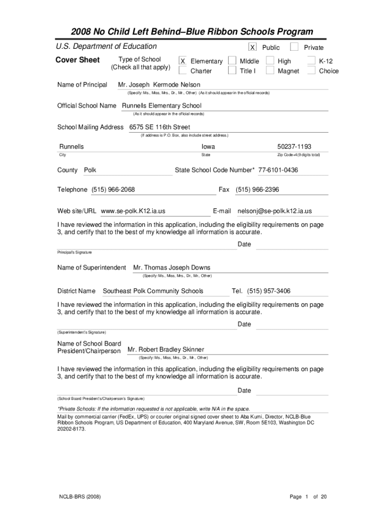 2008 No Child Left BehindBlue Ribbon Schools Program U.S. Department of Education Type of School (Check all that apply)Cover Sheet Name of PrincipalXPublicPrivateX ElementaryMIddleHighK12CharterTitle
