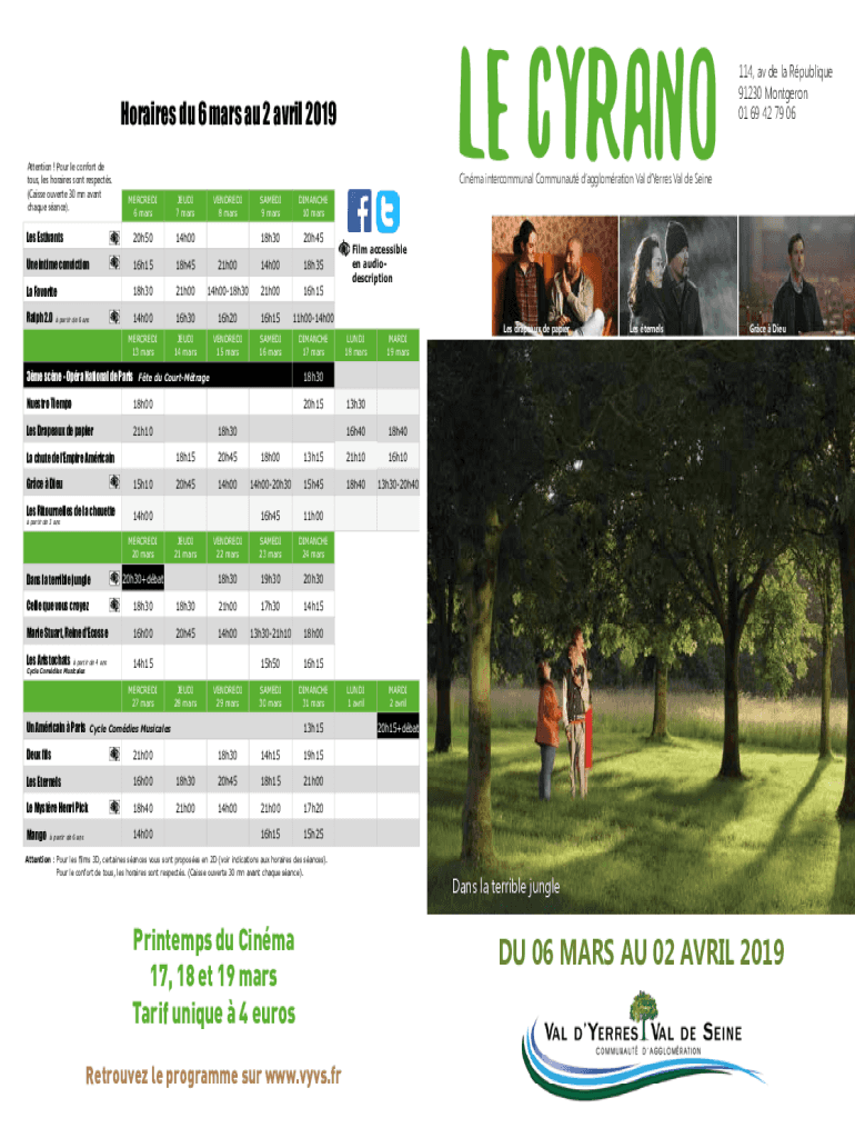114, av de la Rpublique 91230 Montgeron 01 69 42 79 06Horaires du 6 mars au 2 avril 2019 Attention ! Pour le confort de tous, les horaires sont respects. (Caisse ouverte 30 mn avant chaque sance).Cinma