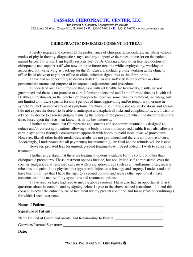 532 Route 70 West, Cherry Hill, NJ 08002 P: 8568570018 F: 8568570081 www.drcassara.comCHIROPRACTIC INFORMED CONSENT TO