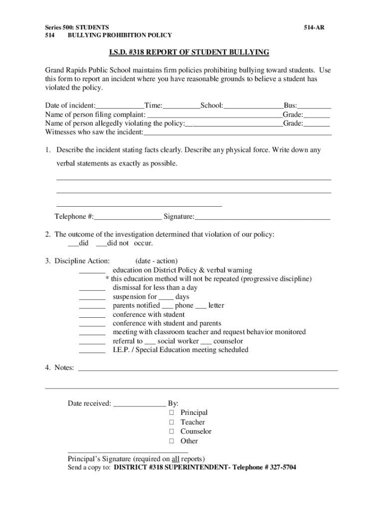 BULLYING PROHIBITION POLICY514ARI. S.D. #318 REPORT OF STUDENT BULLYING