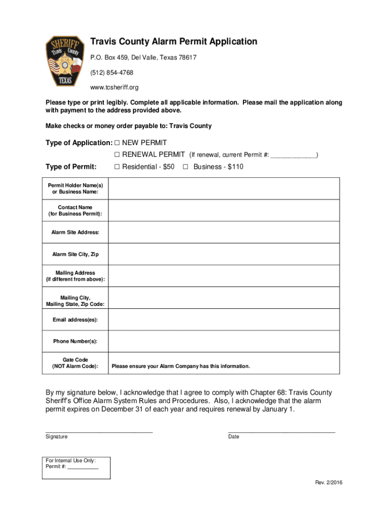 Obtain the alarm permit application form from the Travis County Sheriff's Office website or office.