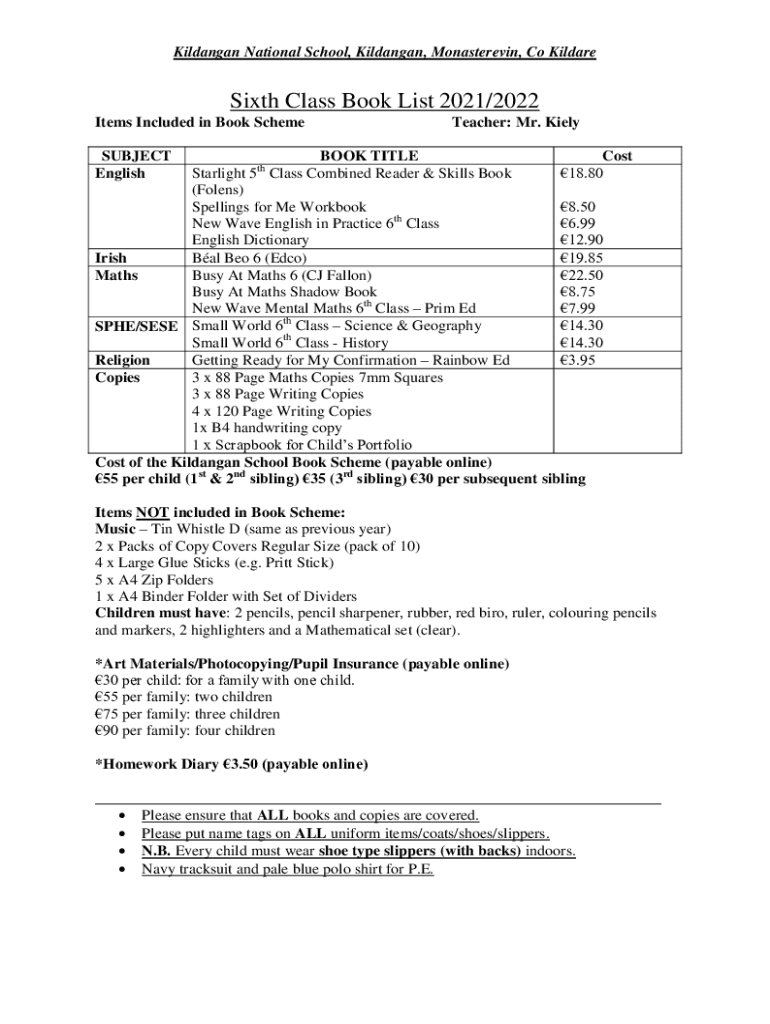 Kildangan National School, Kildangan, Monasterevin, Co KildareSixth Class Book List 2021/2022 Items Included in Book Scheme SUBJECT EnglishTeacher: Mr. KielyBOOK TITLE Cost Starlight 5 Class Combined