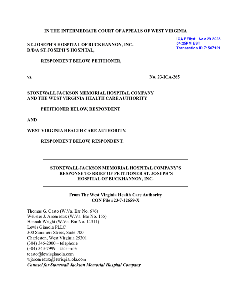 IN THE INTERMEDIATE COURT OF APPEALS OF WEST VIRGINIA ICA EFiled: Nov 29 2023 04:25PM EST Transaction ID 71507121ST. JOSEPH\'S HOSPITAL OF BUCKHANNON, INC. D/B/A ST. JOSEPHS HOSPITAL, RESPONDENT BELOW,