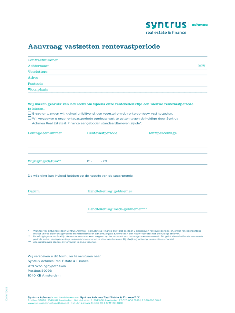 Aanvraag vastzetten rentevastperiode Contractnummer AchternaamM/V Voorletters Adres Postcode WoonplaatsWij maken gebruik van het recht om tijdens onze rentebedenktijd een nieuwe rentevastperiode te