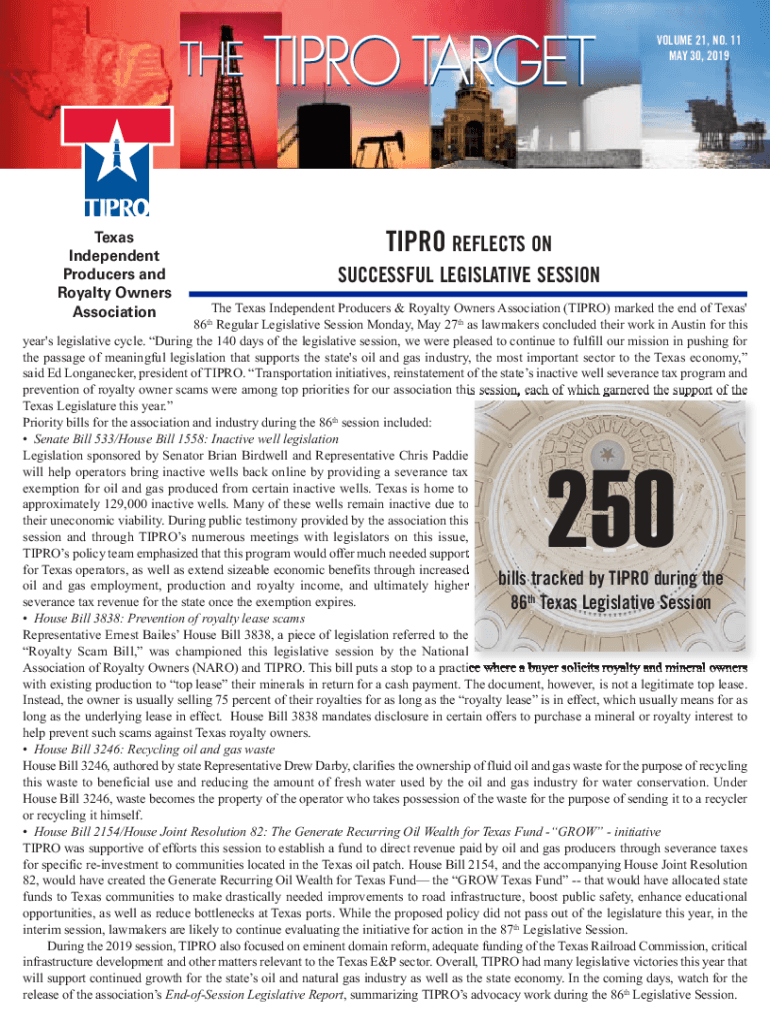 THETexas Independent Producers and Royalty Owners AssociationTIPRO TARGETVOLUME 21, NO. 11 MAY 30, 2019TIPRO REFLECTS ON SUCCESSFUL LEGISLATIVE SESSIONThe Texas Independent Producers & Royalty Owners