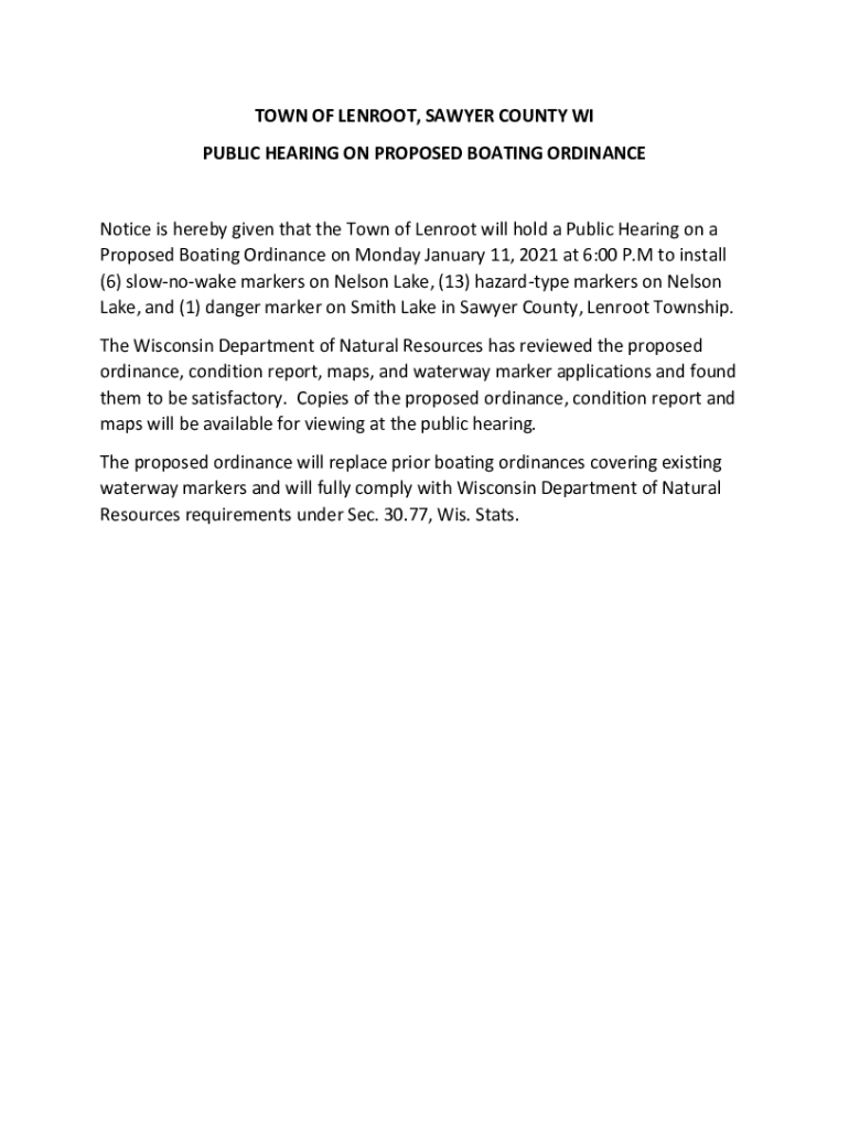 TOWN OF LENROOT, SAWYER COUNTY WI PUBLIC HEARING ON PROPOSED BOATING ORDINANCENotice is hereby given that the Town of Lenroot will hold a Public Hearing on a Proposed Boating Ordinance on Monday January