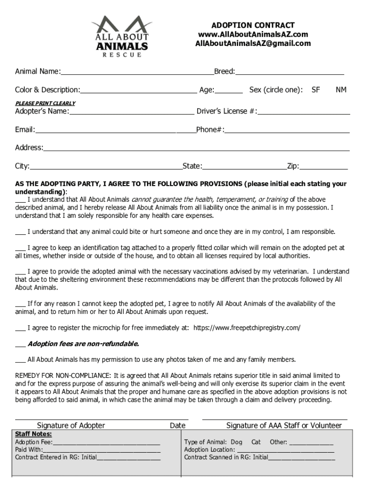 ADOPTION CONTRACT www.AllAboutAnimalsAZ.com AllAboutAnimalsAZ@gmail.com Animal Name:___Breed:___ Color & Description:___ Age:___ Sex (circle one):SFNMPLEASE PRINT CLEARLYAdopters Name:___ Drivers