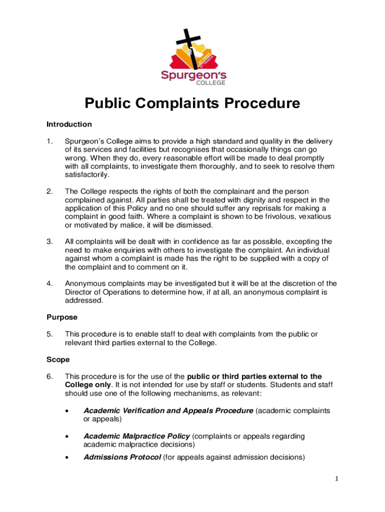 Public Complaints Procedure Introduction 1.Spurgeons College aims to provide a high standard and quality in the delivery of its services and facilities but recognises that occasionally things can