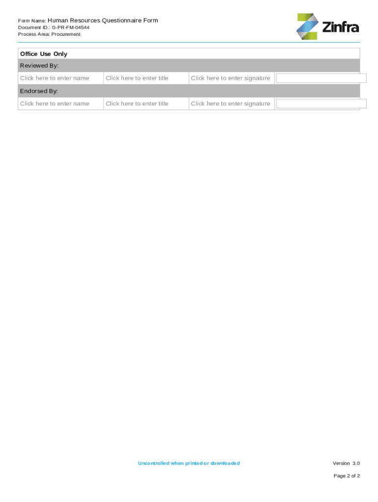 The Human Resources Questionnaire is a document required to be submitted to the required address to provide certain info. It has to be filled-out and signed, which may be done manually in hard copy, or using a particular solution like PDFfiller. It helps to complete any PDF or Word document directly from your browser (no software requred), customize it depending on your requirements and put a legally-binding electronic signature. Right away after completion, you can easily send the Human Resources Questionnaire to the relevant recipient, or multiple individuals via email or fax. The blank is printable too because of PDFfiller feature and options presented for printing out adjustment. In both electronic and in hard copy, your form should have a clean and professional outlook. Also you can turn it into a template to use later, without creating a new blank form over and over. All that needed is to customize the ready template.