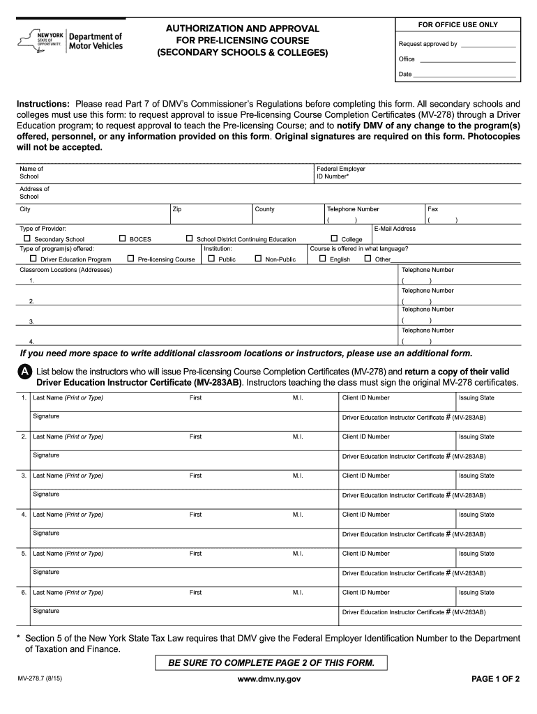 FOR OFFICE USE ONLY AUTHORIZATION AND APPROVAL FOR PRE-LICENSING COURSE (SECONDARY SCHOOLS & COLLEGES) Request approved by Office Date Instructions: Please read Part 7 of DMV s Commissioner s Regulations