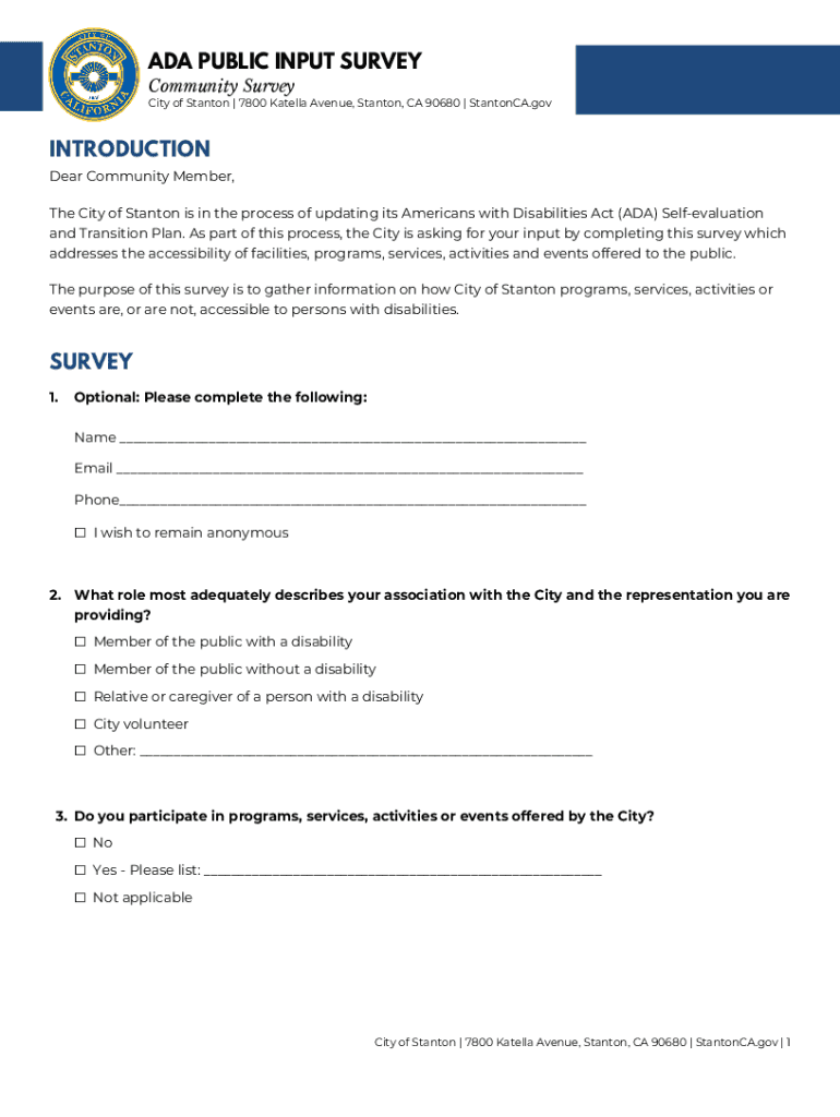 ADA PUBLIC INPUT SURVEY Community SurveyCity of Stanton | 7800 Katella Avenue, Stanton, CA 90680 | StantonCA.govINTRODUCTION Dear Community Member, The City of Stanton is in the process of updating
