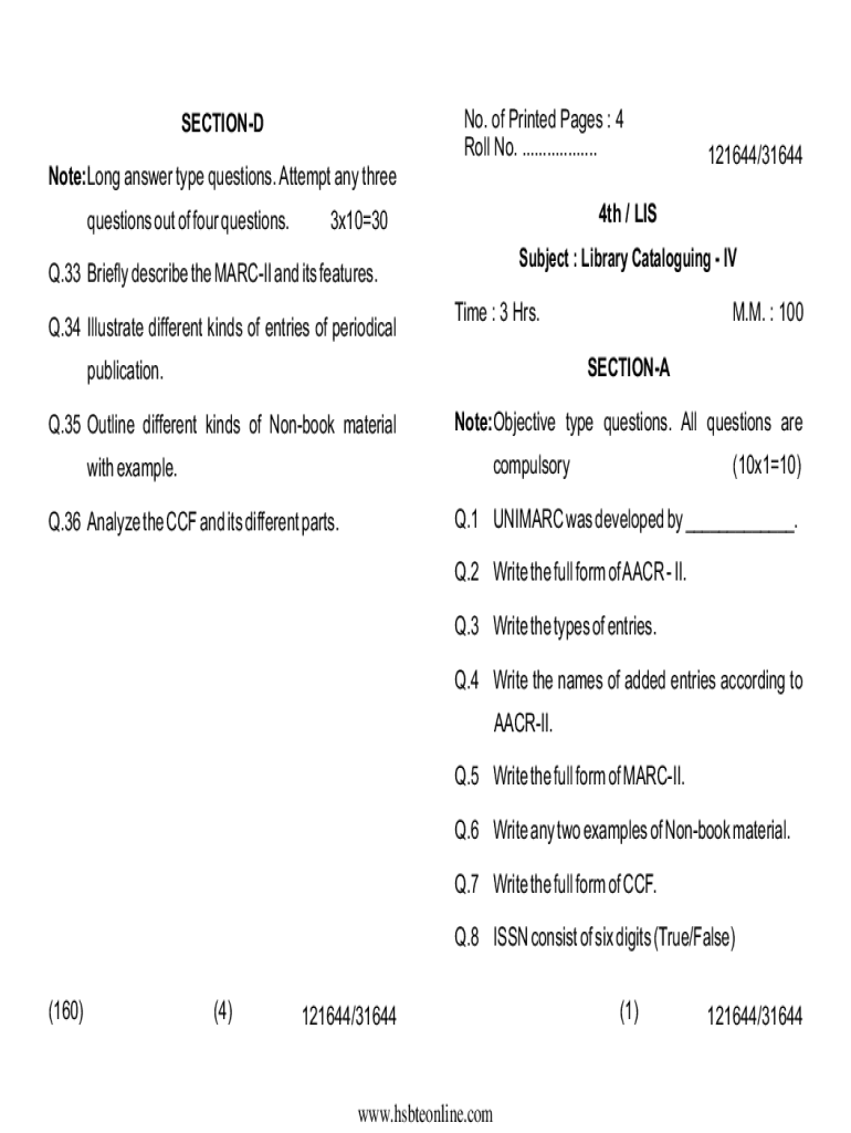 No. of Printed Pages : 4 Roll No. ..................SECTIOND Note:Long answer type questions. Attempt any three questions out of four questions.4th / LIS3x1030Subject : Library Cataloguing IVQ.33