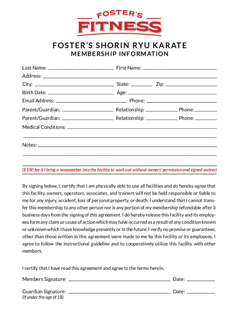 F OSTERS SH O R I N R Y U KA R ATE M E M B E R S H I P IN F O R M AT IO N Last Name:First Name:Address: City:State:Birth Date:Age:Email Address:Zip: Phone:Parent/Guardian:Relationship:Phone:Parent/Guardian:Relationship:Phone:Medical