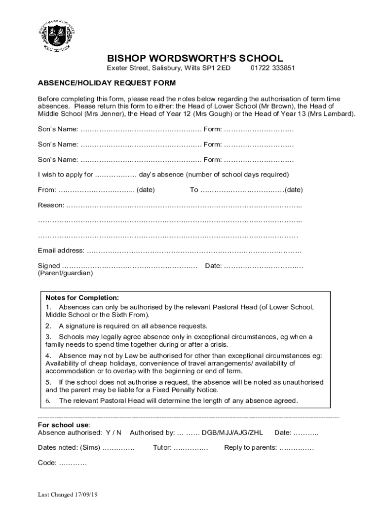 BISHOP WORDSWORTHS SCHOOL Exeter Street, Salisbury, Wilts SP1 2ED01722 333851ABSENCE/HOLIDAY REQUEST FORM Before completing this form, please read the notes below regarding the authorisation of term