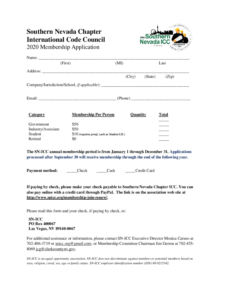 Southern Nevada Chapter International Code Council 2020 Membership Application Name: ___ (First) (MI) Last Address: ___ (City) (State) (Zip) Company/Jurisdiction/School, if applicable): ___ Email: