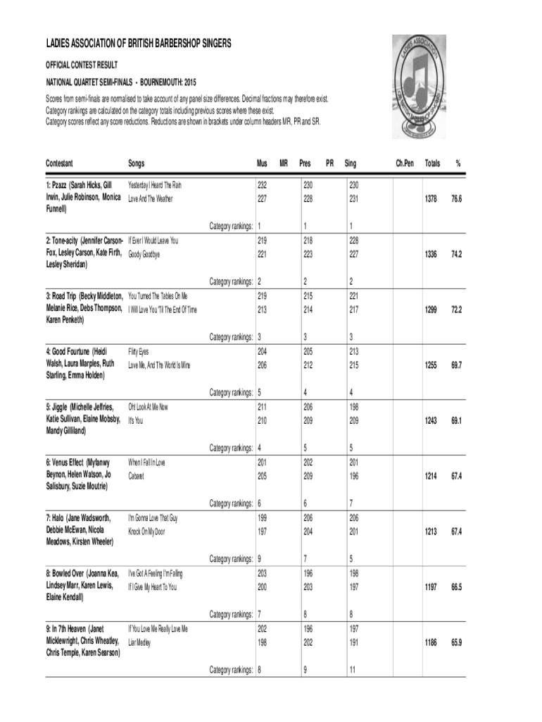 LADIES ASSOCIATION OF BRITISH BARBERSHOP SINGERS OFFICIAL CONTEST RESULT NATIONAL QUARTET SEMIFINALS BOURNEMOUTH: 2015 Scores from semifinals are normalized to take account of any panel size differences.