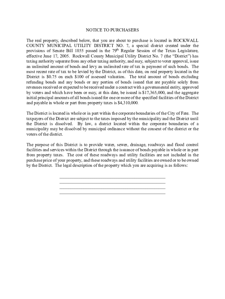 NOTICE TO PURCHASERS The real property, described below, that you are about to purchase is located in ROCKWALL COUNTY MUNICIPAL UTILITY DISTRICT NO. 7, a special district created under the provisions