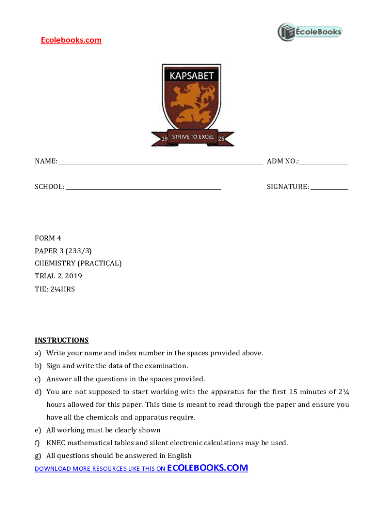 Ecolebooks.comNAME: ___ ADM NO.:___ SCHOOL: ___SIGNATURE: ___FORM 4 PAPER 3 (233/3) CHEMISTRY (PRACTICAL) TRIAL 2, 2019 TIE: 2HRSINSTRUCTIONS a) Write your name and index number in the spaces provided